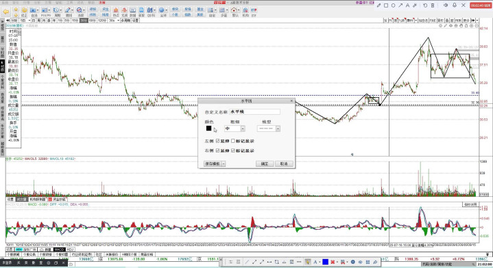 现在要到三十分钟图上来看,在三十分钟图上这个位置涨上来之后是走了第一波的回调,第二波的反弹,第三波的下跌,目前是处于第三波的下跌过程中,所以在这里把它当成是三十分钟结构的上涨中枢看,如果真的走坏,这里后面这一笔上弓是不能过这个高点的,那才是走坏了。