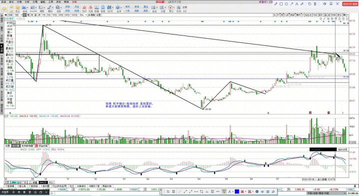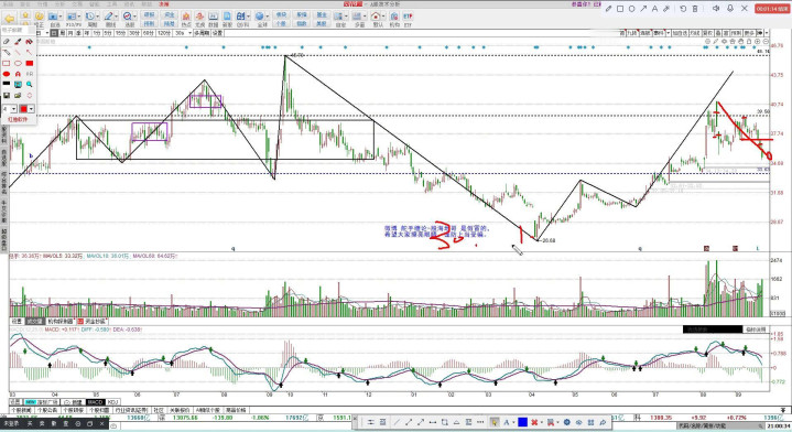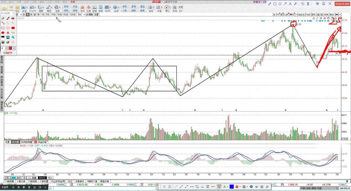 三十九点五六这个位置也跟大家讲了,这个位置是怎么来的?经过多次试探,最后得到的这个位置,所以这是一个重大的压力位,在压力位面前选择回调,我认为这并不是怂,真的怂是站不稳三十三点六直接下去。它是真怂。未来这里还有一笔回拉,等这一笔跌完之后看这笔回拉能不能过前高就可以了。这是船舶。